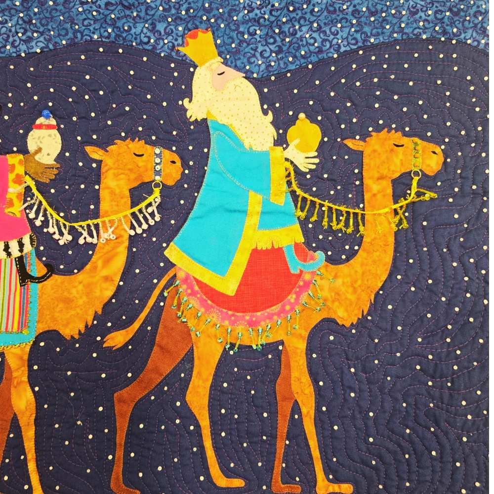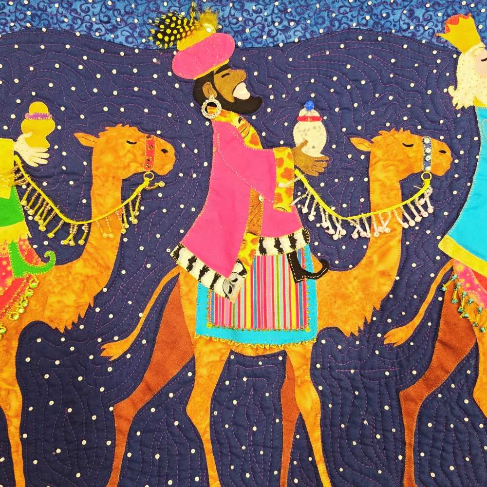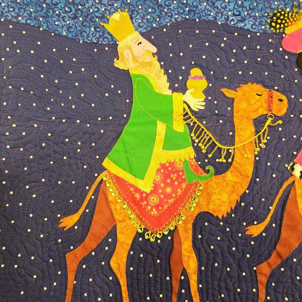 Los Tres Reyes Magos. Diseñado con amor y dedicación, este hermoso quilt es mucho más que una pieza decorativa; es una historia que se despliega en cada puntada, un homenaje a la magia, la tradición y la esperanza que trae la Navidad.